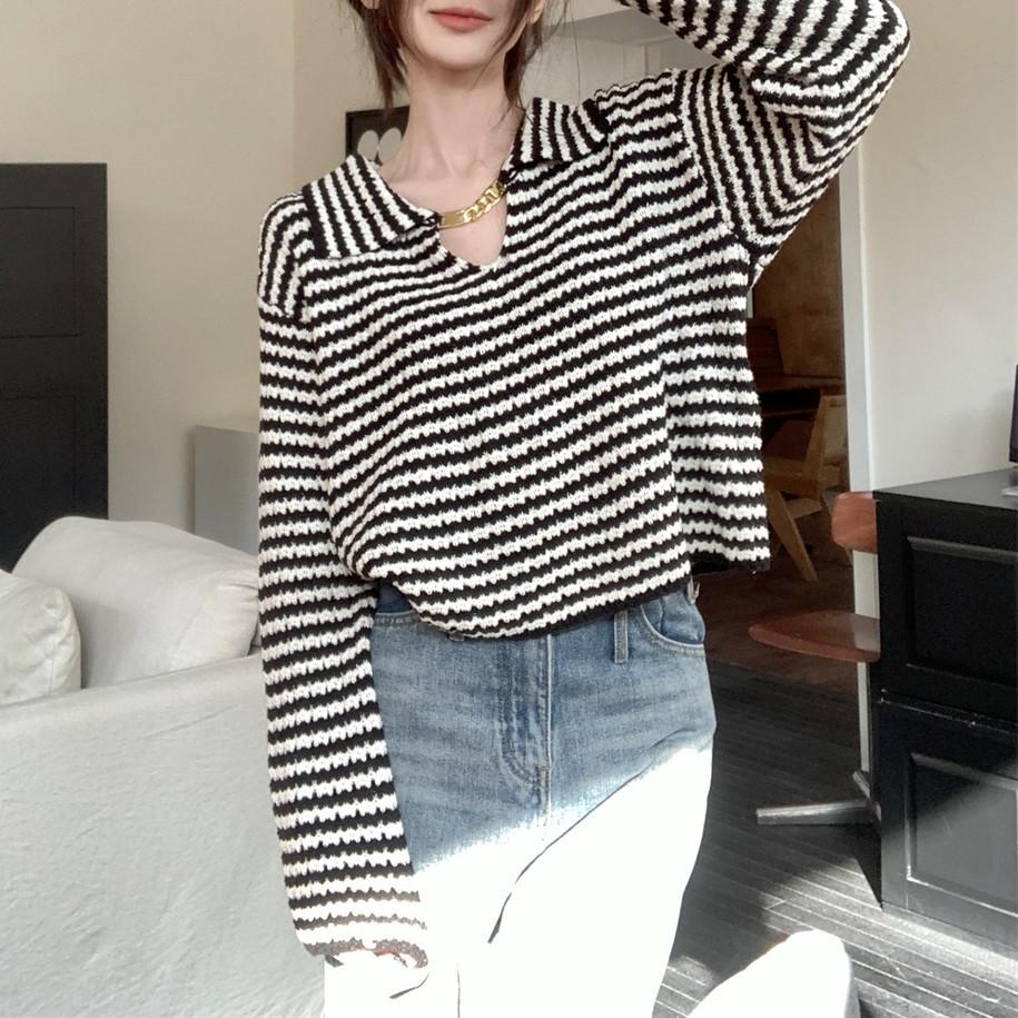 Осень-зима, черно-белый полосатый свитер, женская уличная одежда, свободный пуловер, джемпер, топы, женские вязаные свитера с длинными рукавами и лацканами