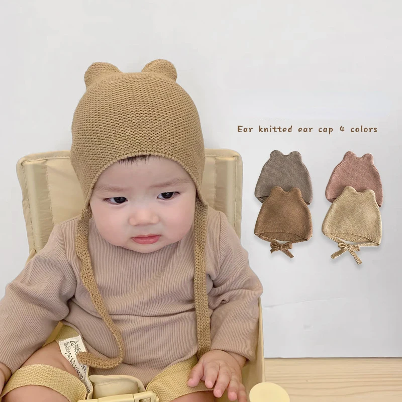 Осень-зима 2022, детская шапка для мальчиков и девочек, Корейская версия, шапка с ремешком и защитой для ушей, теплые вязаные шапки для малышей,...