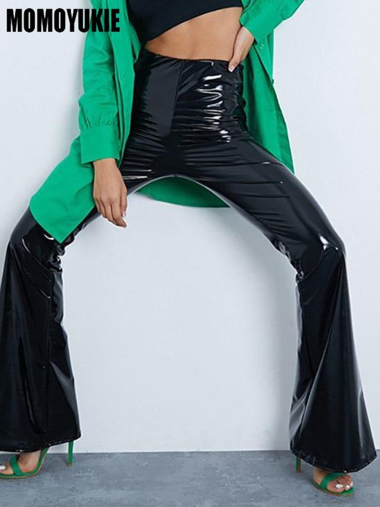 Осень-зима 2022, модные длинные брюки с высокой талией, женские тонкие брюки из лакированной кожи с расклешенным низом, женские винтажные брюки L чёрный