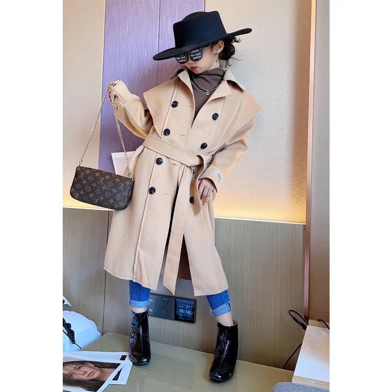 Осень-зима 2022, шерстяное пальто для девочек, длинное двойное кашемировое теплое пальто, новое модное однотонное повседневное пальто