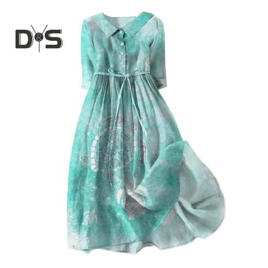 Осень-лето Платье с лацканами, рукавами три четверти, трапециевидной формы, с цифровым цветочным принтом, в богемном стиле, плиссированные, на шнуровке, полуоднобортная рубашка типа миди L синий