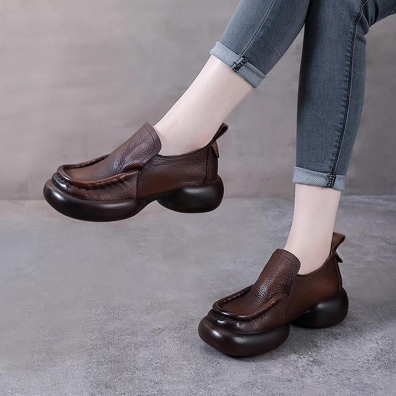 Осень новые кожаные на толстой подошве круглый носок черные маленькие кожаные туфли женские толстый каблук подошва-маффин овчина ретро ленивые одинарные туфли 40 коричневый