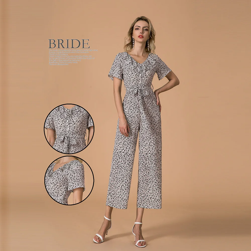 Fashion American Style Women Short Sleeve jumpsuits Ruffle Collar Harem Pants Casual Ladies Overall Wide Legs Bodysuit