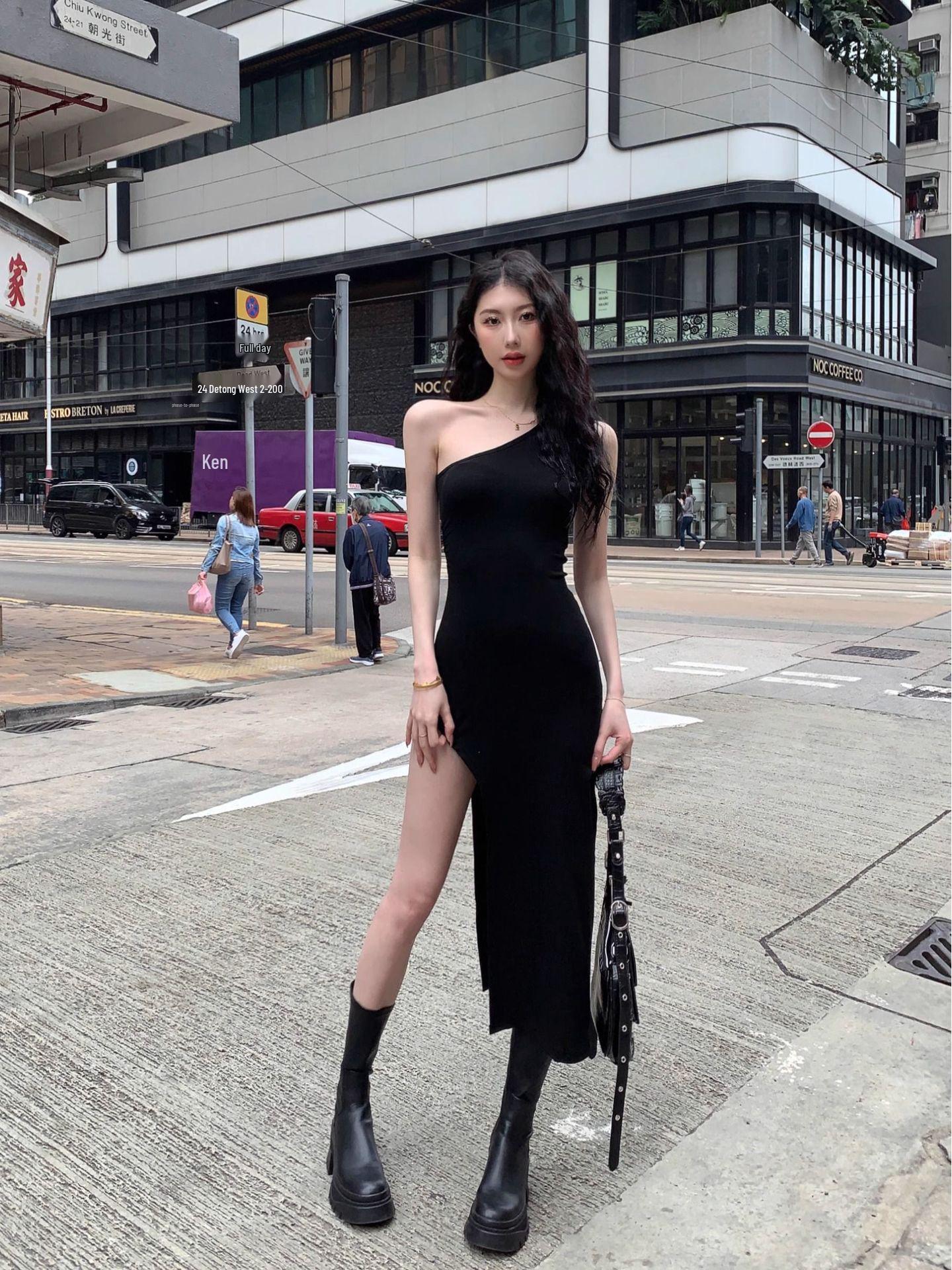 Острое летнее платье-майка на одно плечо, облегающее бедра - Сексуальное, стройнящее и трендовое Medium чёрный