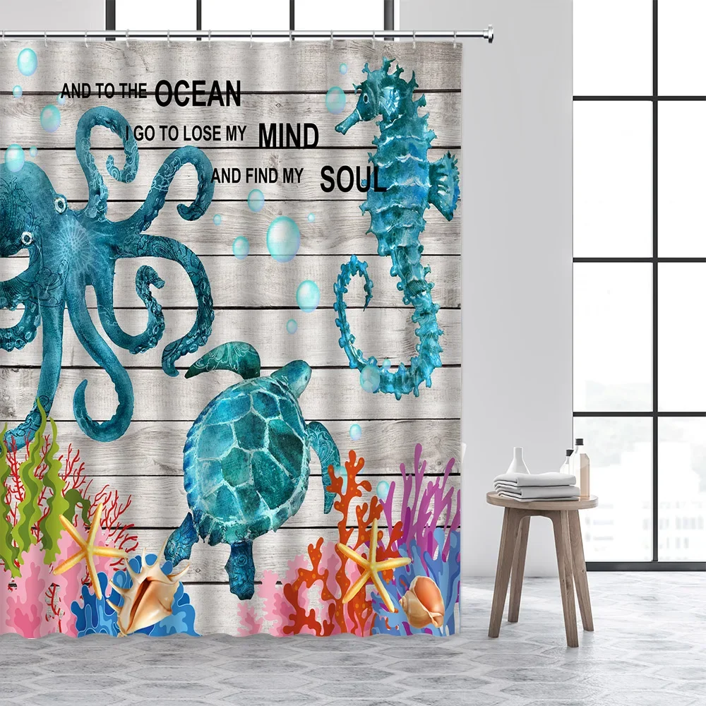 Осьминог, море Штора для душа в виде черепахи, акварельная морская лошадь, Коралловый раковина, серая деревянная доска, тканевый Декор для ванной комнаты с крючками