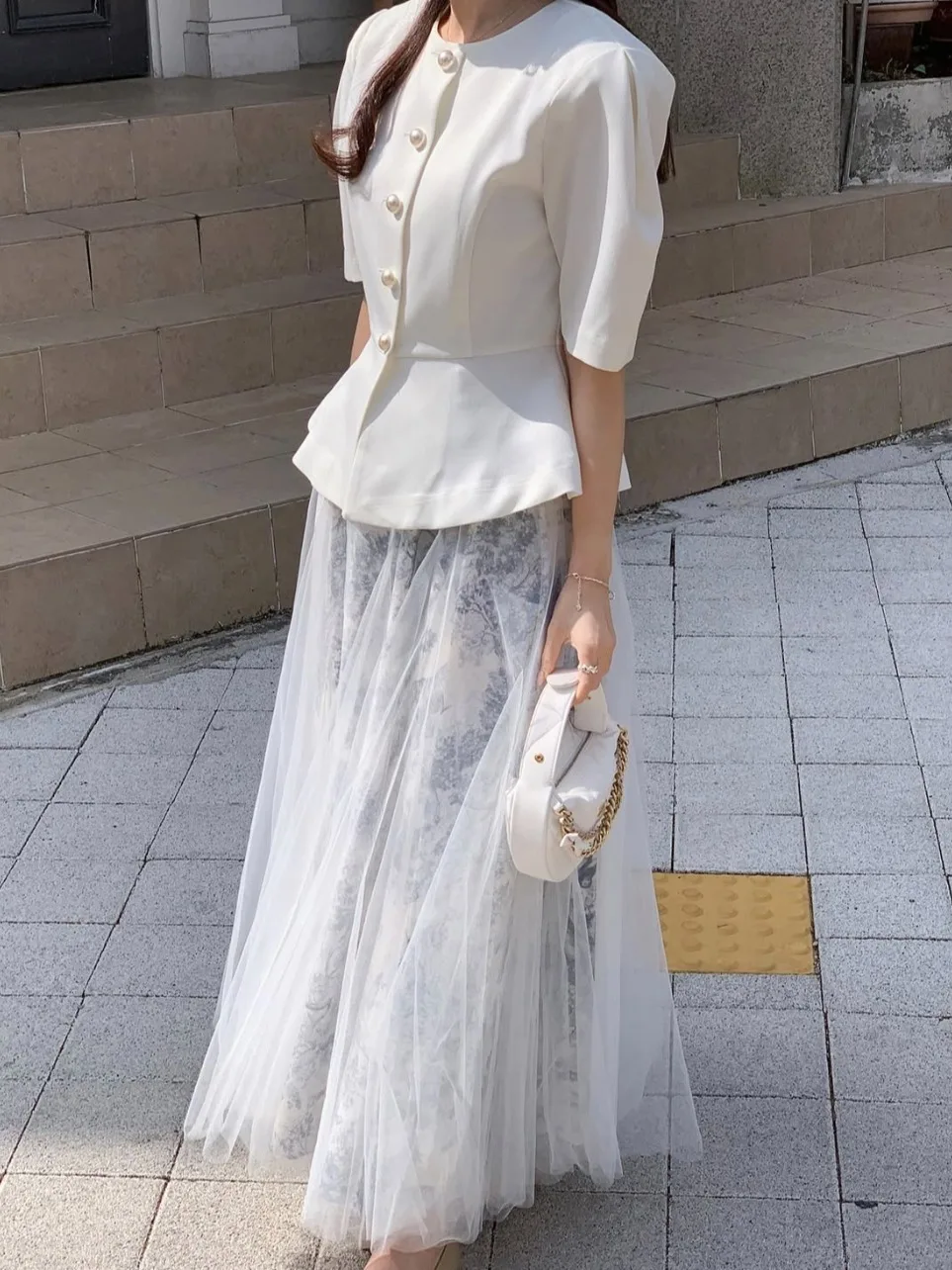 Летний костюм с жемчужными пуговицами, комплект из джата и кружевной юбки с китайским чернильным принтом, модная женская одежда, ансамбль