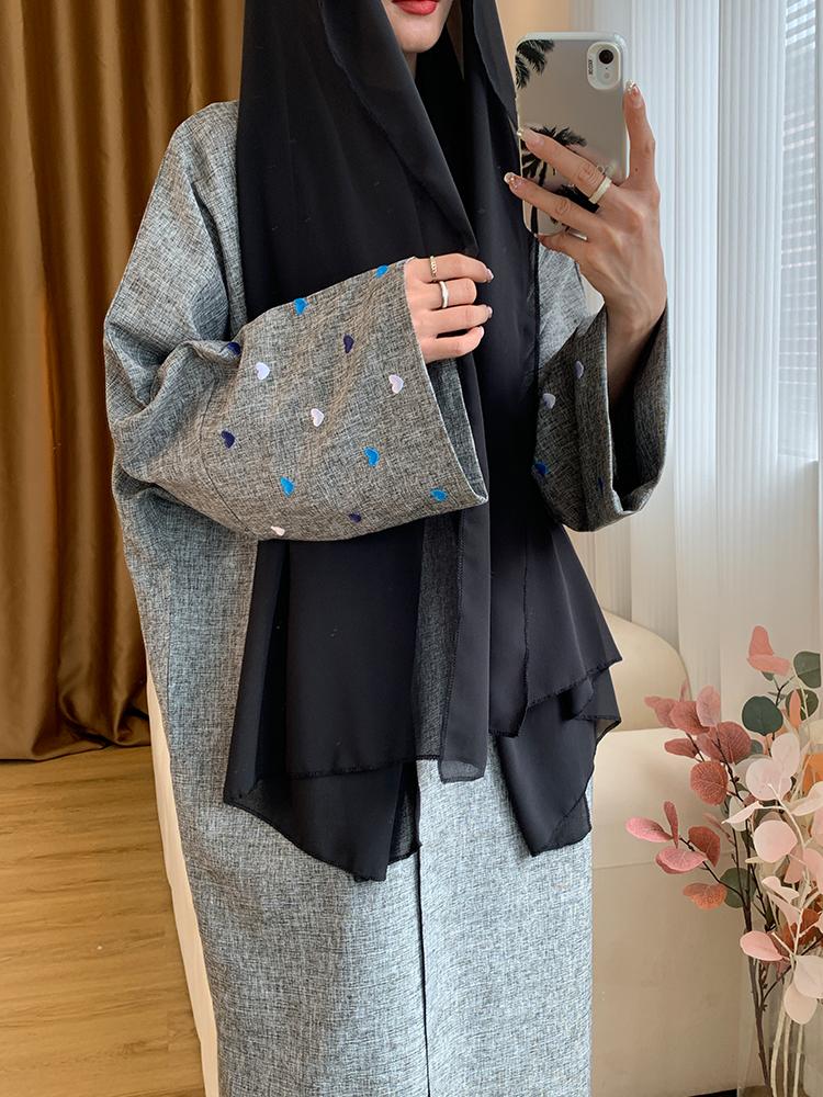 Открытое льняное абайя с вышивкой в форме сердца и рукавами «летучая мышь», свободный мусульманский комплект для женщин, 2024, платье без вуали внутри