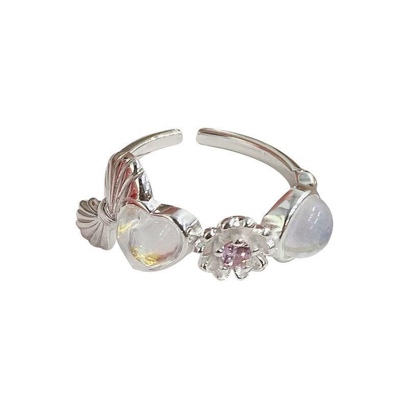 Открытое модное кольцо в форме сердца с бантом-бабочкой и нежным цветком из лунного камня, идеально подходящее для женщин