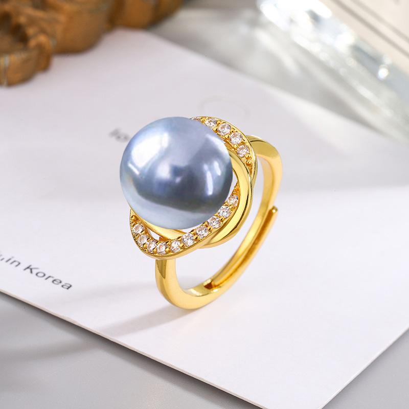Открытое регулируемое кольцо с 14-миллиметровым золотым, белым, шампанским и фиолетовым жемчугом из ракушек и цирконами для женщин Adjustable Open