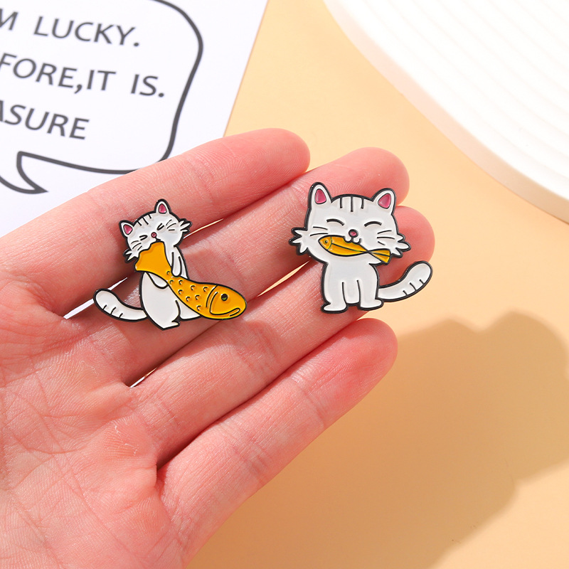 Cute Cartoon White Cat Eat Fish Brooches Pin for Women Fashion Dress Coat Shirt Demin Metal Funny Brooch Pins Badges Backpack Gift Jewelry