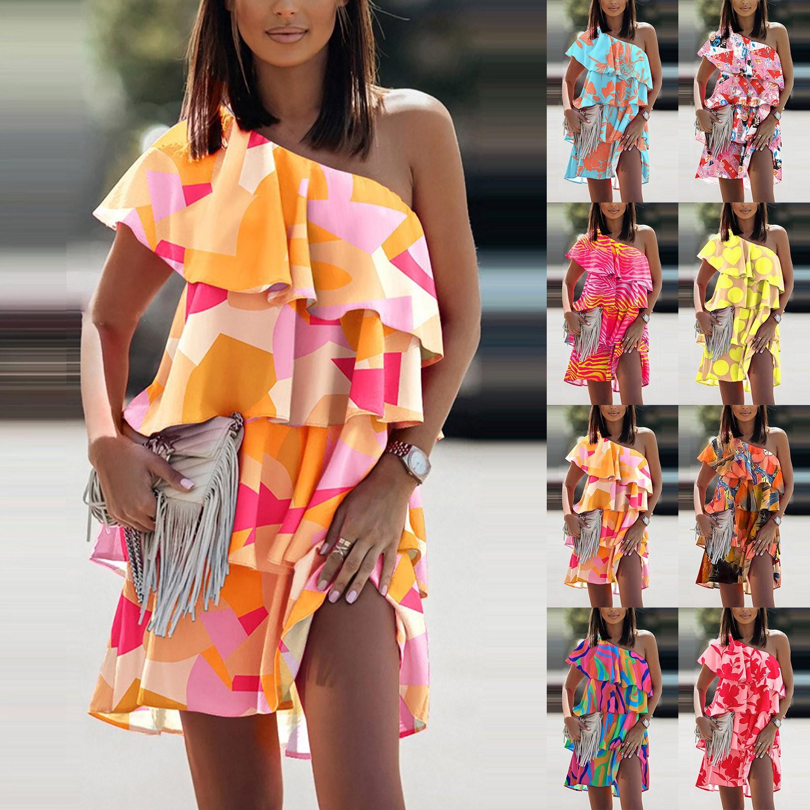 (Отличный дом)Женское сексуальное свободное повседневное платье на одно плечо с рюшами и цветочным принтом