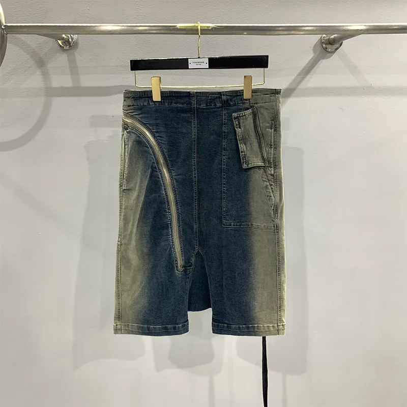 New Rick Denim Shorts Y2k Streetwear Jorts Men Clothes Ro Owens Street Slant Zipper Gradient Slim Washed Suspenders