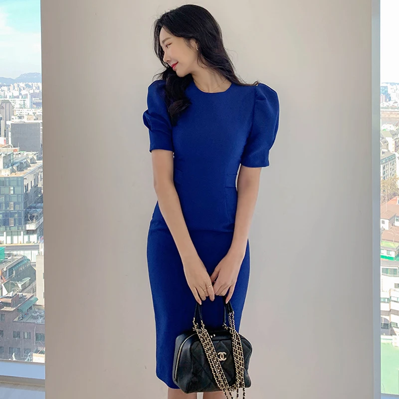 Официальное офисное платье, летнее простое Стильное элегантное синее приталенное вечернее платье с пышными рукавами и завязкой сзади, весн...