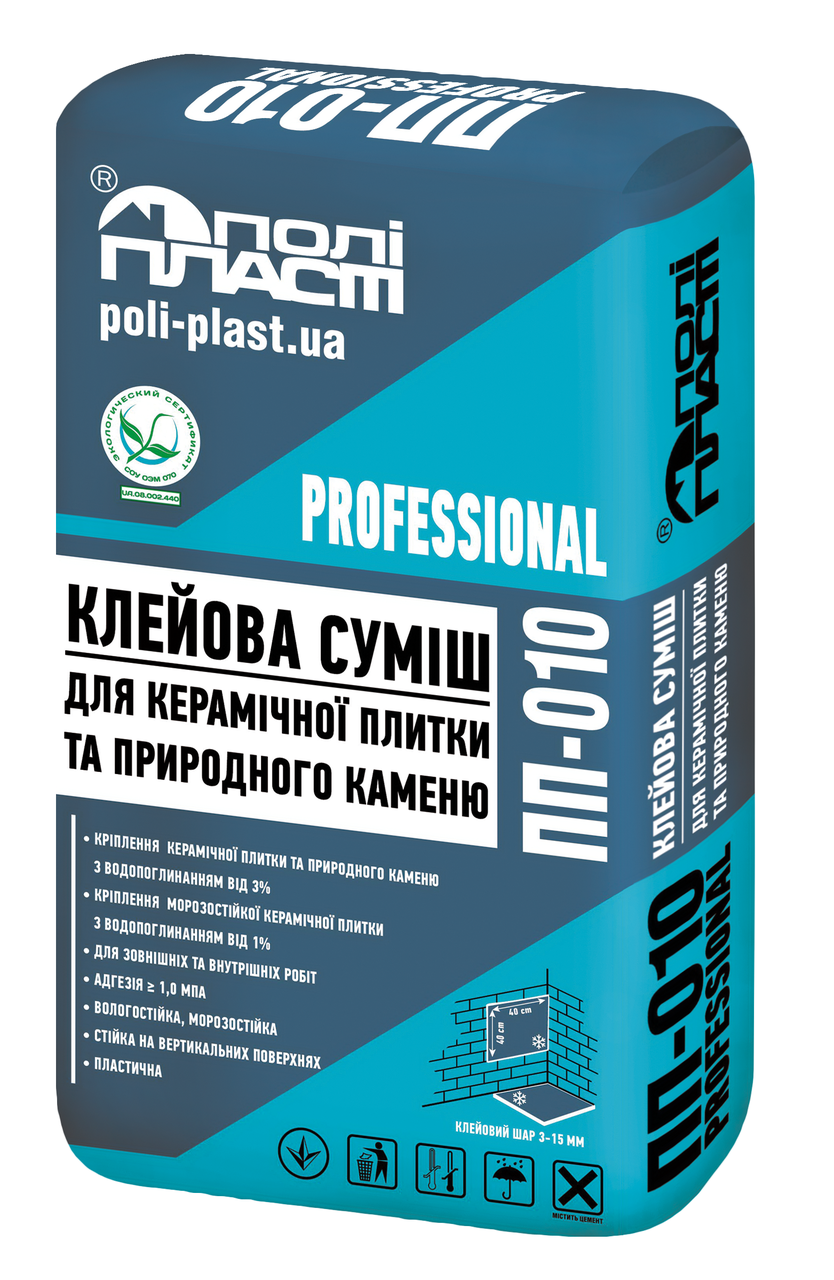 Клеевая смесь ПП-010 PROFESSIONAL - готовая сухая клеевая смесь для крепления различных видов керамической плитки с водопоглощением не менее 1% и природного камня (например, песчаника) с водопоглощением не менее 3% размером не более 40 * 40 см на прочные минеральные горизонтальные и вертикальные основания, стойкие к деформации (бетонные, цементно-песчаные, цементно-известковые, кирпичные, основы из ячеистых бетонов и др.).