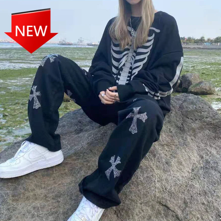 Брюки-карго женские с широкими штанинами, готический принт, уличная одежда в стиле Харадзюку, длинные винтажные штаны в стиле хип-хоп, черны...