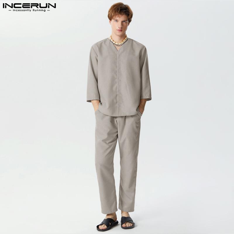 INCERUN Мужская однотонная рубашка с рукавом 3/4, длинные брюки, повседневные свободные костюмы