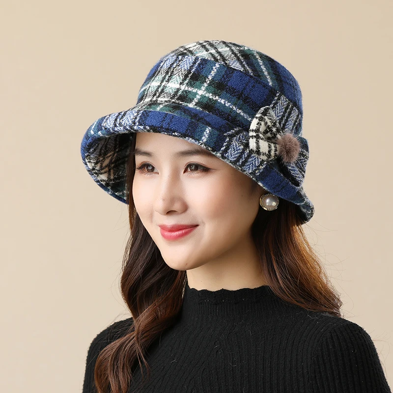 Панама женская шерстяная в клетку, модная винтажная плотная теплая Складная шапка в рыбацком стиле, с бантом, Осень-зима