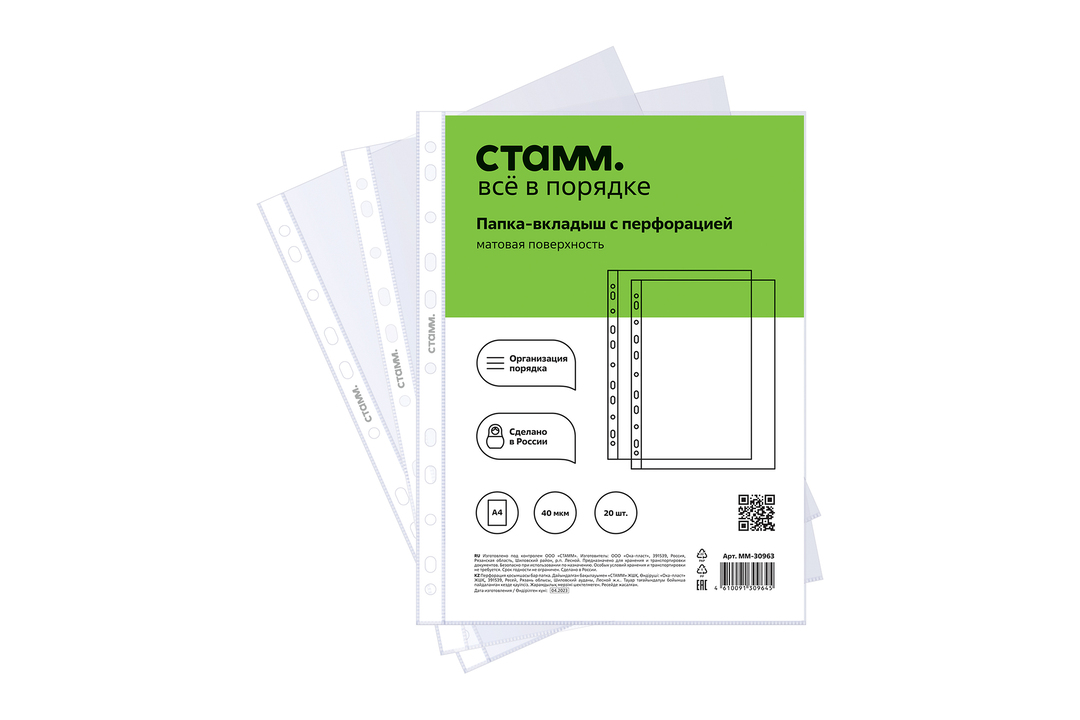 Папка-вкладыш с перфорацией Стамм А4 40 мкм матовая 20 шт, 4 г