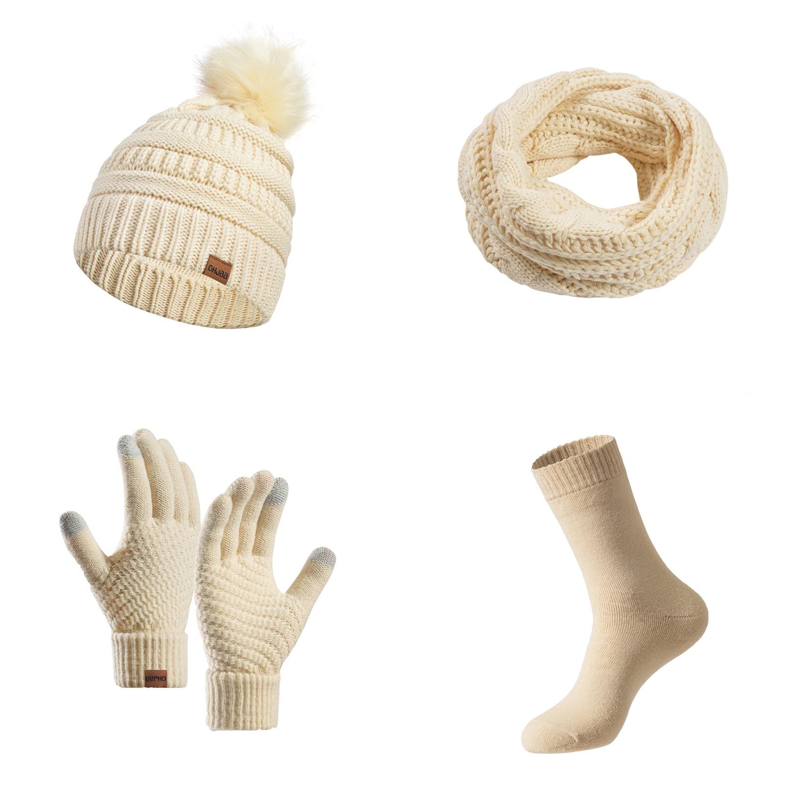 Парная теплая шерстяная шапка, вязаная плюс бархатная утолщенная взрослая шапка, шарф, перчатки, носки, комплект из четырех предметов One Size бежевый