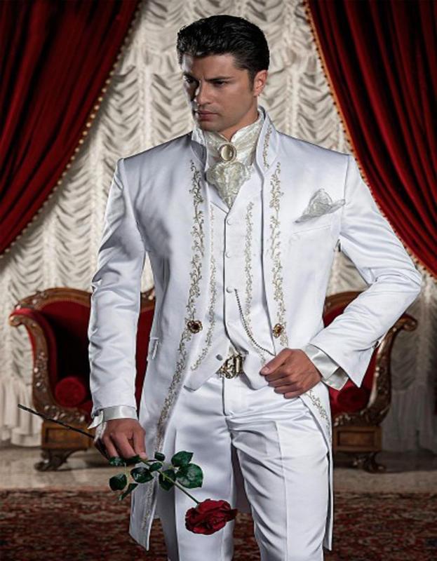 Custom Made Gold Embroidery Groom Tuxedos Stand Collar Groomsmen Blazer Man Wedding Suits (Jacket+Pants+Vest+Tie+Handkerchief), As picture