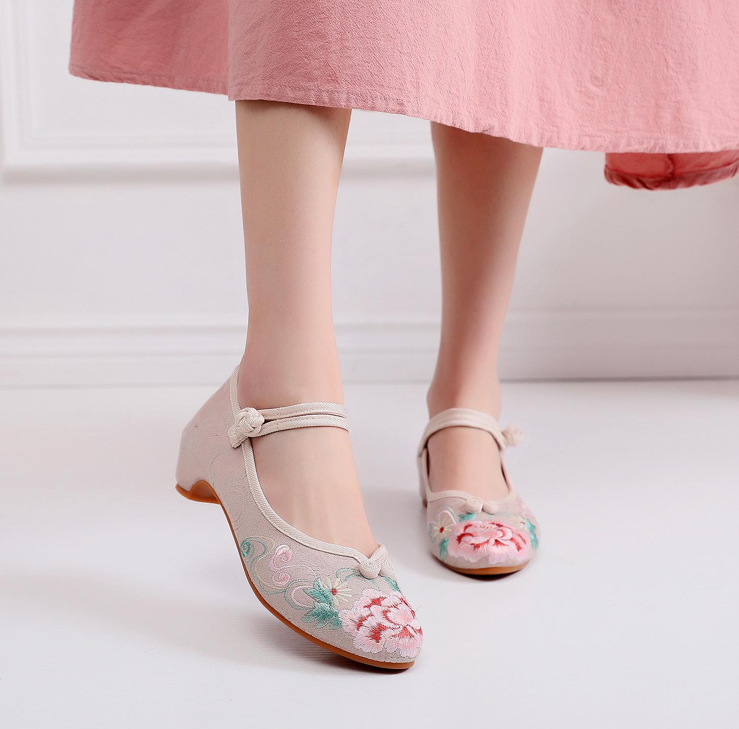 Пекинские вышитые туфли-лодочки в ретро-стиле на среднем каблуке для ципао: Этническая обувь для танцев ханьфу с заостренными носками 35 бежевый