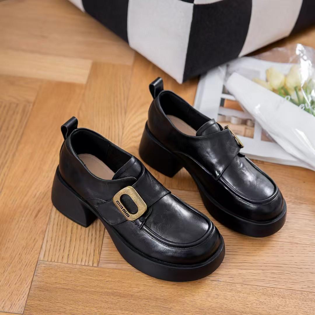Первый слой коровьей кожи британская мода женские туфли-одиночки осень новые с круглым носком туфли на платформе толстый каблук ретро маленькие кожаные туфли 35 чёрный
