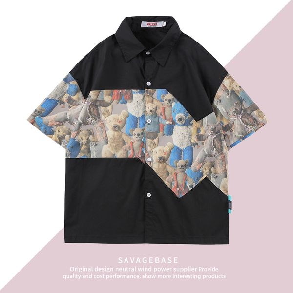 fashion brand couple's new summer shirt ruffian and handsome stitching bear tooling black short sleeve shirt for men, White;black