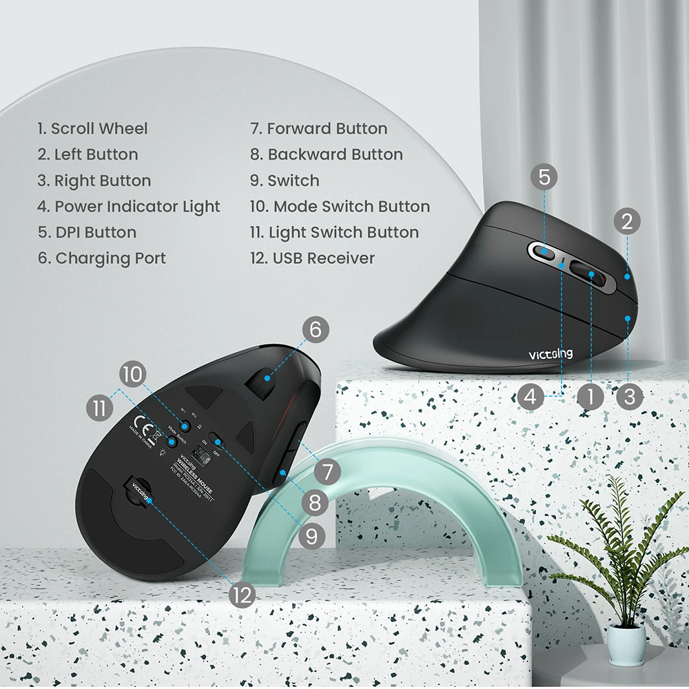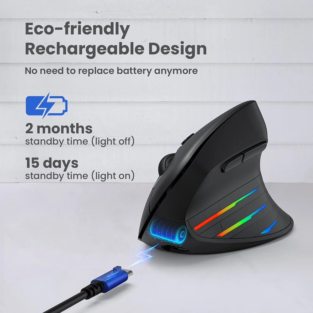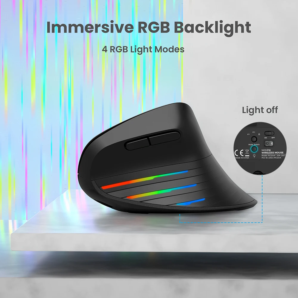 Перезаряжаемая эргономичная мышь VictSing RGB, легко переключать до 3 устройств, вертикальная Беспроводная Bluetooth мышь, 5 регулируемых DPI