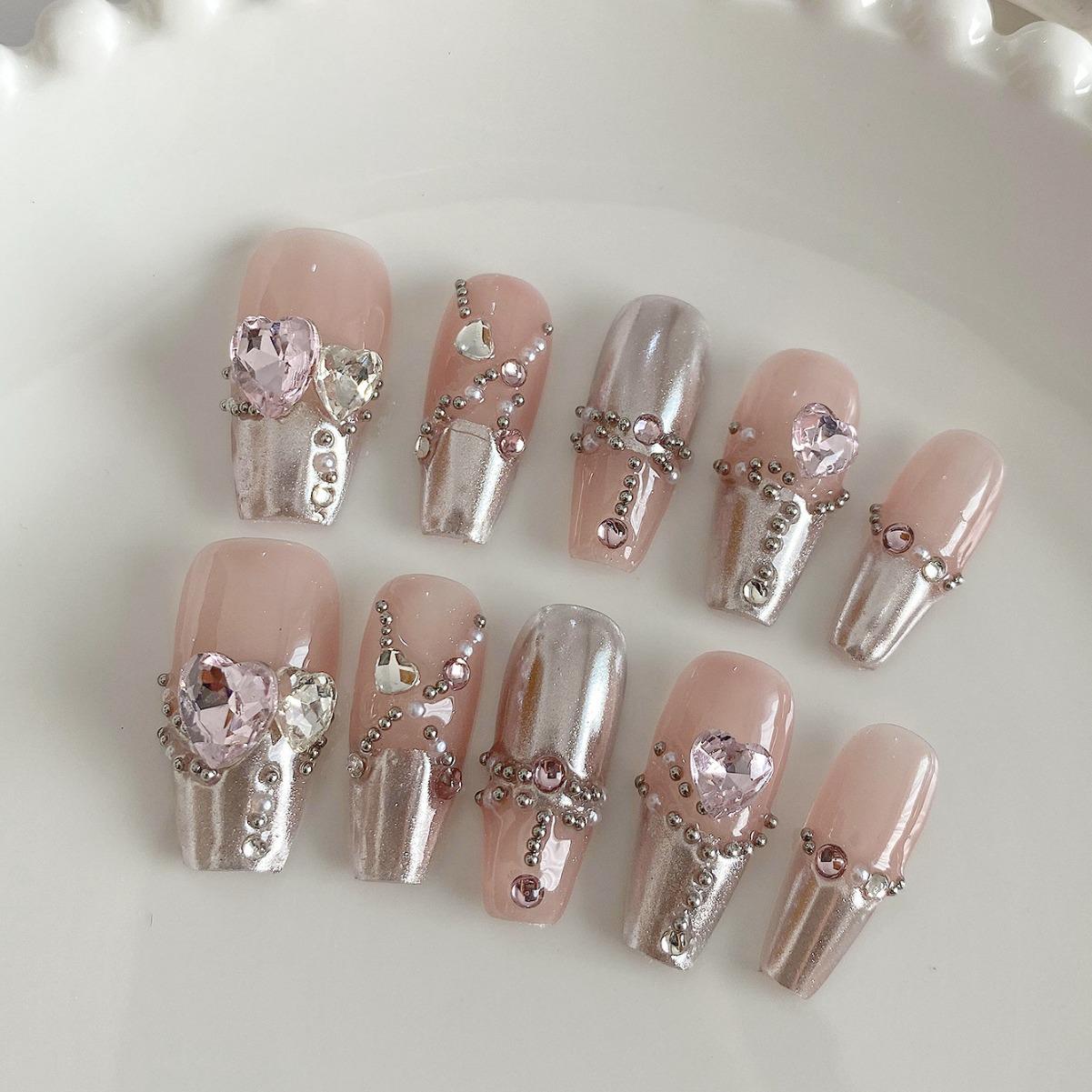 Персиковые ногти-пузыри - Ручная работа, носимые накладные ногти с пудрой «Волшебное зеркало» и дизайном в виде сердечек для роскошного маникюра. S