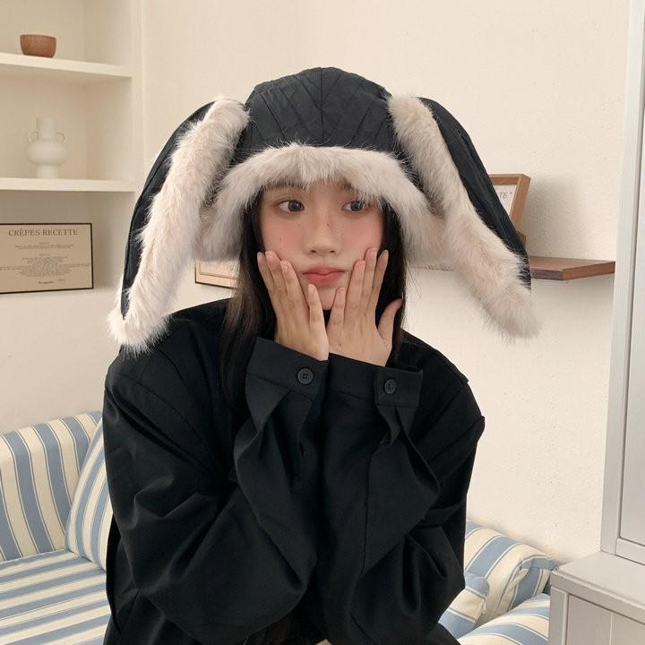 Персонализированная забавная плюшевая шапка с большими кроличьими ушами, женская, осенне-зимняя, новый сезон, теплая, универсальная, с защитой ушей, головная шапка, тренд M(56-58cm) чёрный