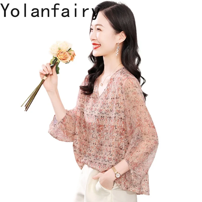 YOLANFAIRY, блузка из 100% натурального шелка тутового шелка, женские летние винтажные футболки с принтом 202, женские легкие роскошные женские топы и блузки