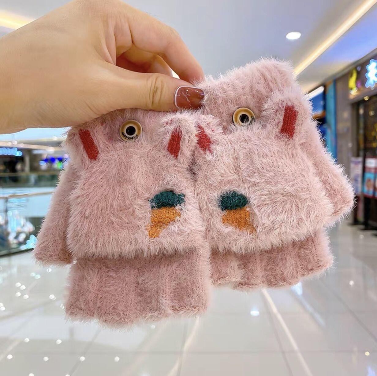 Перчатки детские 4-10 лет с бархатом, утолщенные и теплые, морковь, милая корейская версия мультфильма полупальцевая перекидная вязаная надпись One size