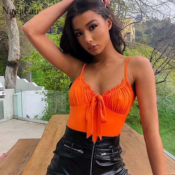 nadafair bow tie up backless summer neon bodysuits women deep v neck skinny orange green, Black;white