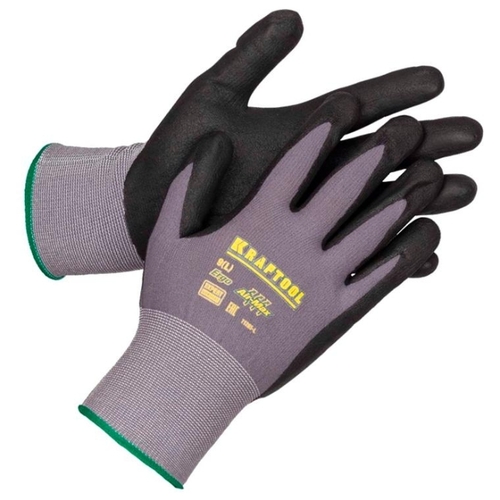 Перчатки нейлоновые с вспененным нитриловым покрытием, 15 класс, M, серый/черный, предназначены для выполнения точных работ в сухой среде, идеально подходят для операций с мелкими деталями., Kraftool EXPERT (11285-M)