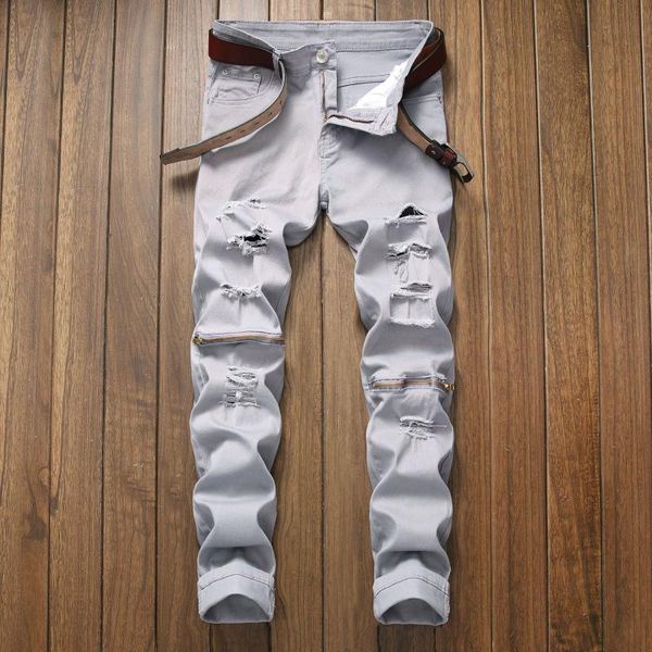 men's jeans fake zippers holes ripped for men individuality fashion casual stretch distressed denim trousers youth straight jean pants, Blue