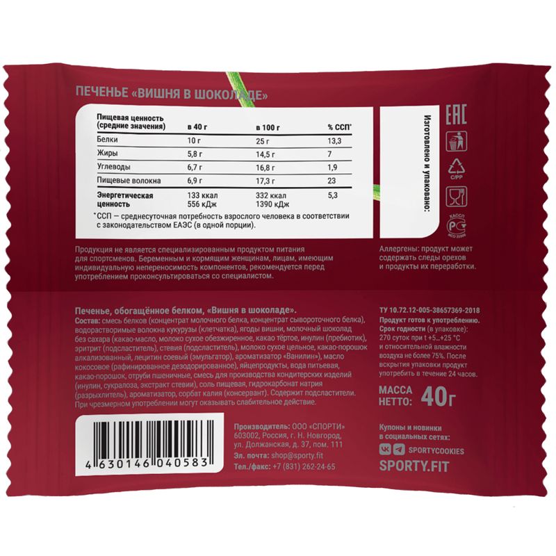 Печенье Sporty Вишня В Шоколаде обогащённое белком, 40 г