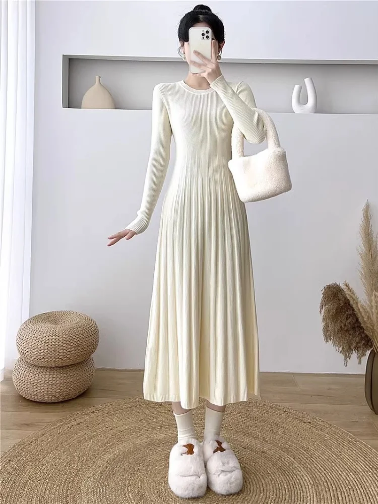 Elegant Women Sweater Dress Ribbed Long Sleeve A Line Casual Slimming Clothes Pullover O-Neck Sexy Party Knit Sweater Dress