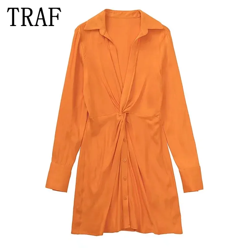 TRAF Zar 2022 Orange Satin Dress Woman Knot Elegant Dresses For Women Button Up Long Sleeve Mini Dress Short Party Dresses