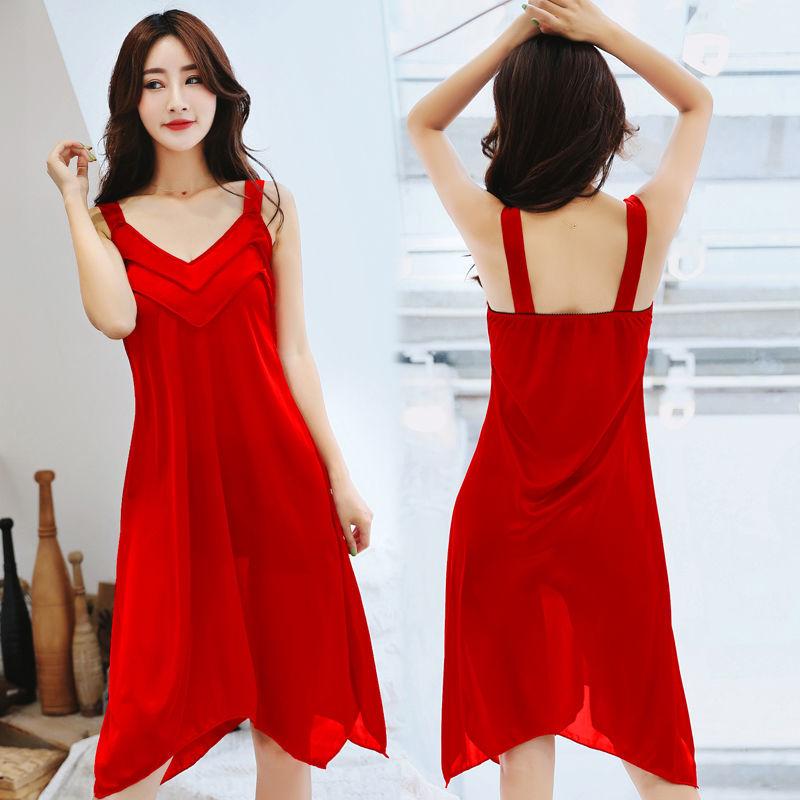 Пижама женская летняя ночная рубашка на бретельках из ледяного шелка, дышащая юбка больших размеров, весенне-летняя кружевная тонкая ночная рубашка средней длины XXXXXL красный