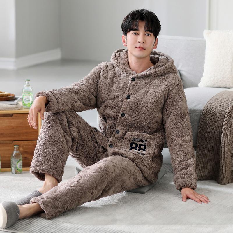 Пижама мужская зимняя флисовая зимняя теплая трехслойная утолщенная куртка с наполнителем коралловый флис с капюшоном на молнии домашняя одежда 3XL