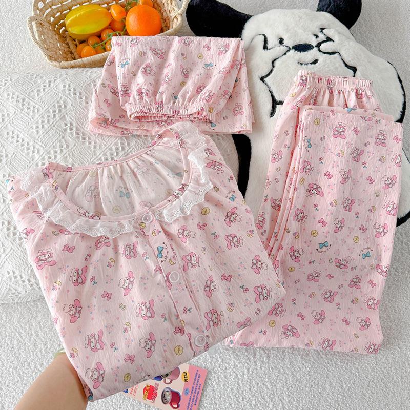 Пижама с круглым вырезом Женская Melody Летняя Милая Мультяшная с коротким рукавом Набор из трех предметов Облачный хлопок Домашняя M