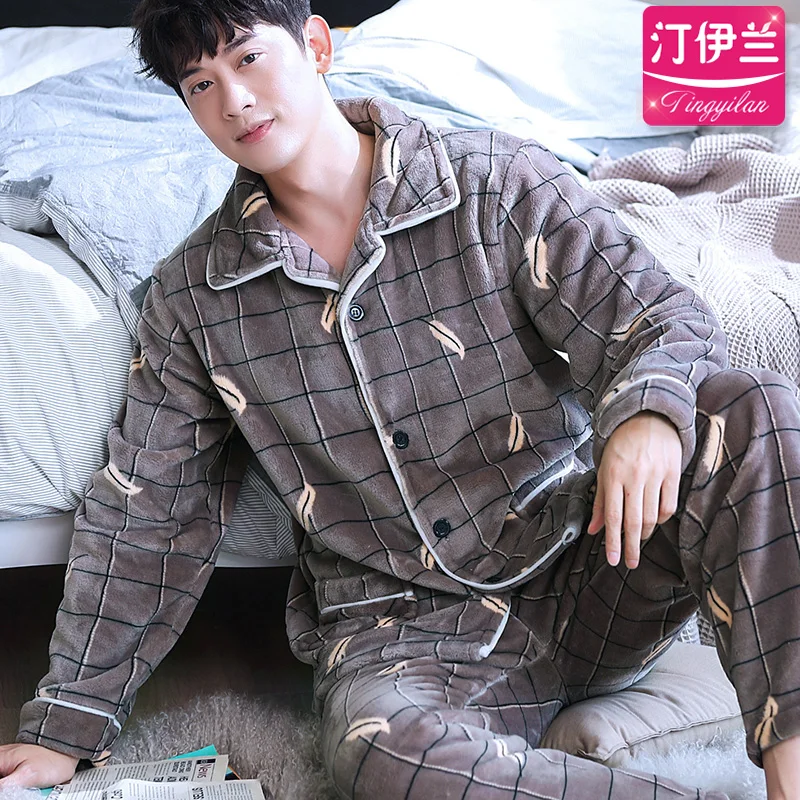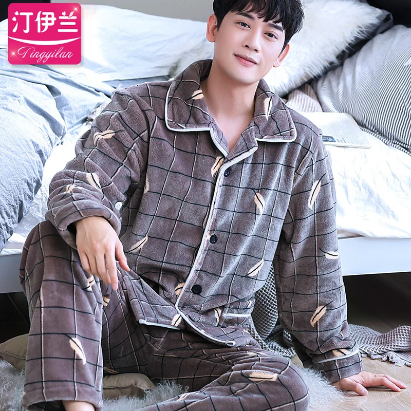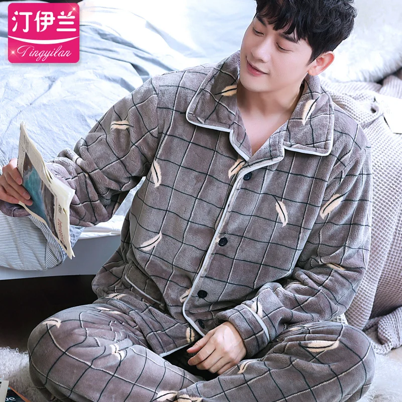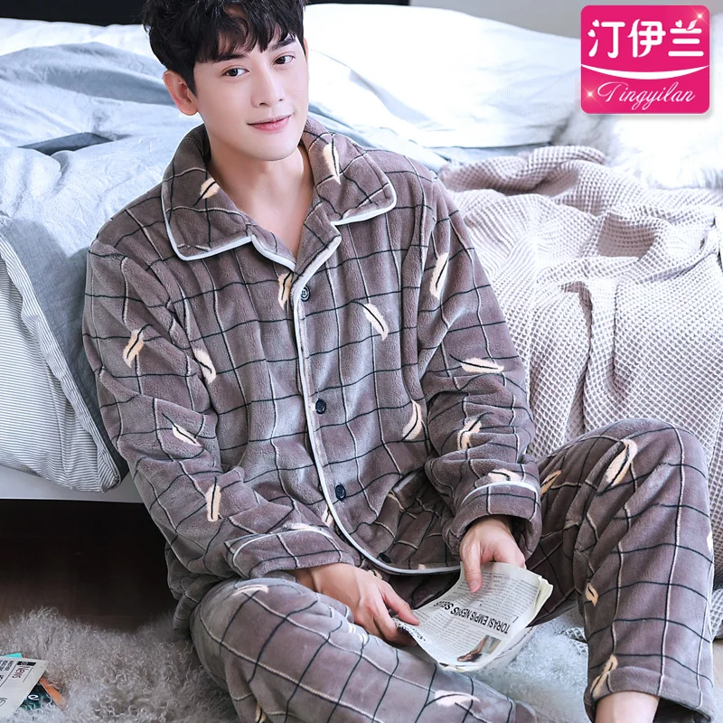 Пижама H5903 Мужская Утепленная, фланелевая, Коралловая, бархатная, ночная рубашка большого размера с длинным рукавом, домашняя одежда, мужская одежда для сна на осень и зиму