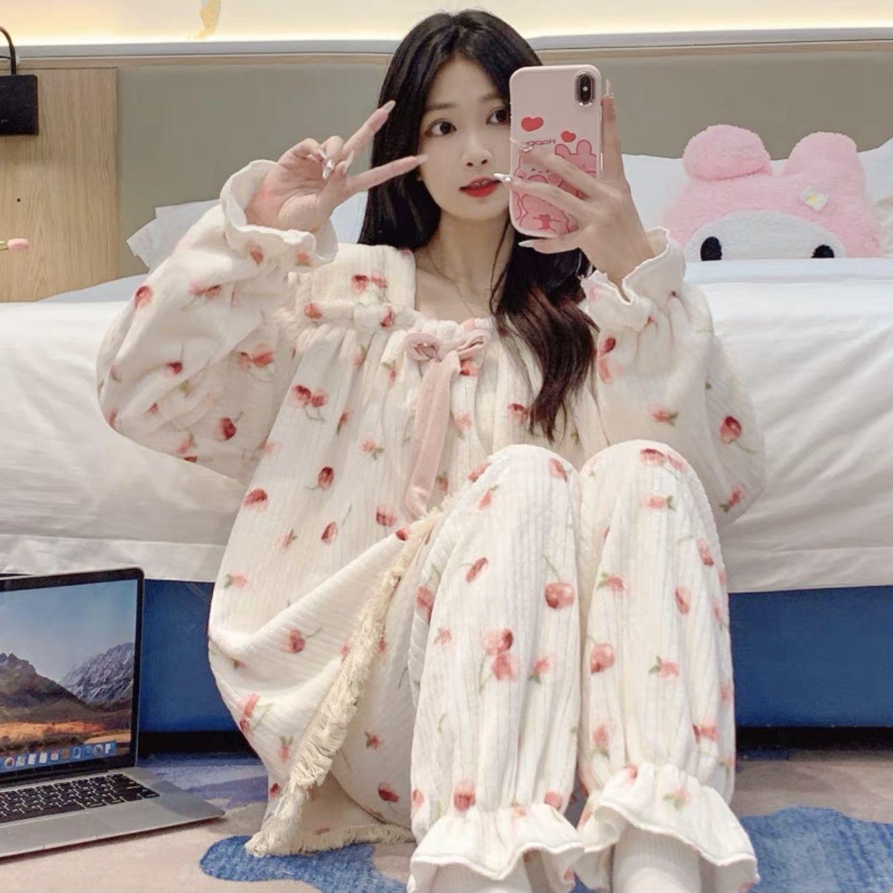 Пижамные штаны комплект женская одежда домашняя одежда зимняя толстая симпатичная коралловый бархат удобная повседневная простая стильная свободная M