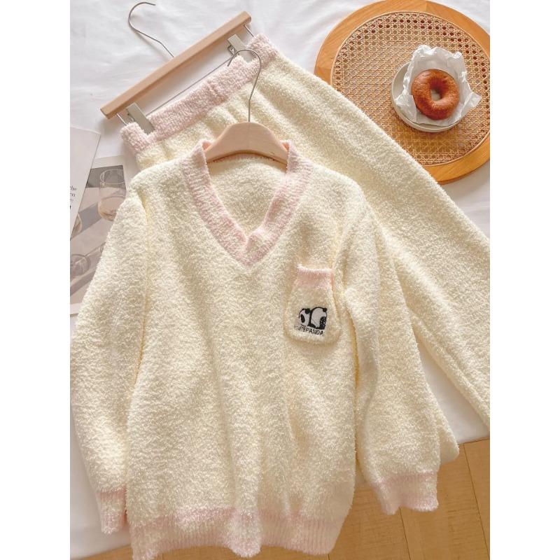 Пижамный комплект из 2 предметов с длинным рукавом и V-образным вырезом, осенне-зимняя плюшевая пижама для женщин, плотная фланелевая одежда для дома, одежда для отдыха One Size