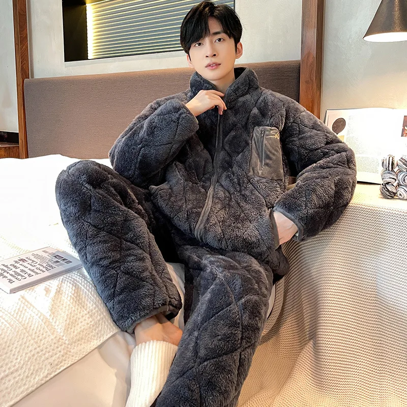 Пижамный костюм на молнии, зимняя мужская одежда для сна, трехслойная утепленная ночная рубашка, пижамы, шерстяная теплая Домашняя одежда из кораллового флиса