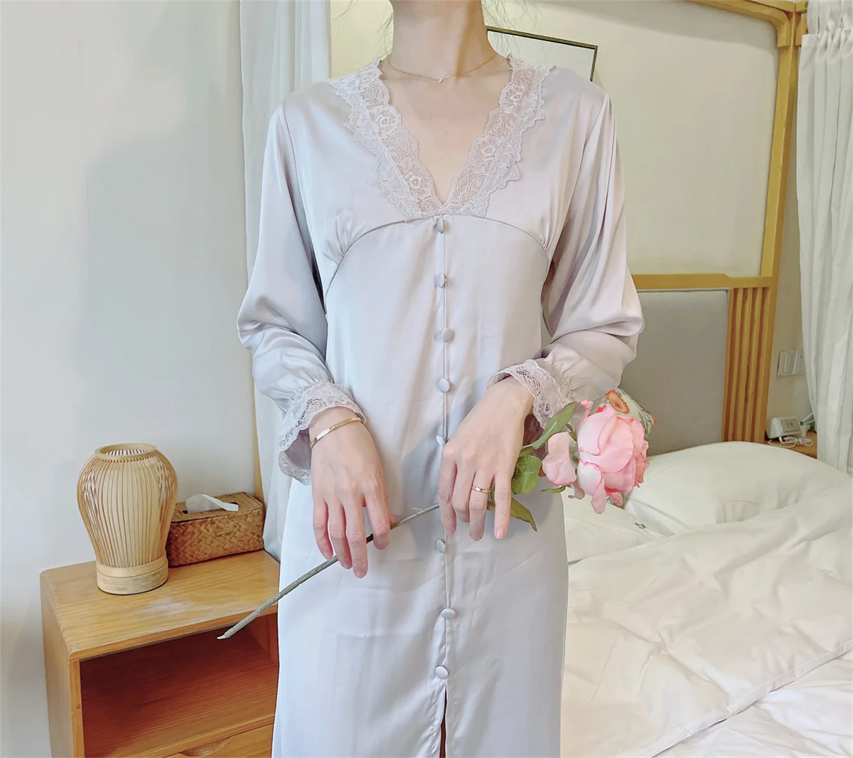 Пижамы для девочек, весна-лето, тонкая, в стиле Корта, лед Шелковая пижама, длинная, до колена, с v-образным вырезом, кружевная, феи, с длинным р...