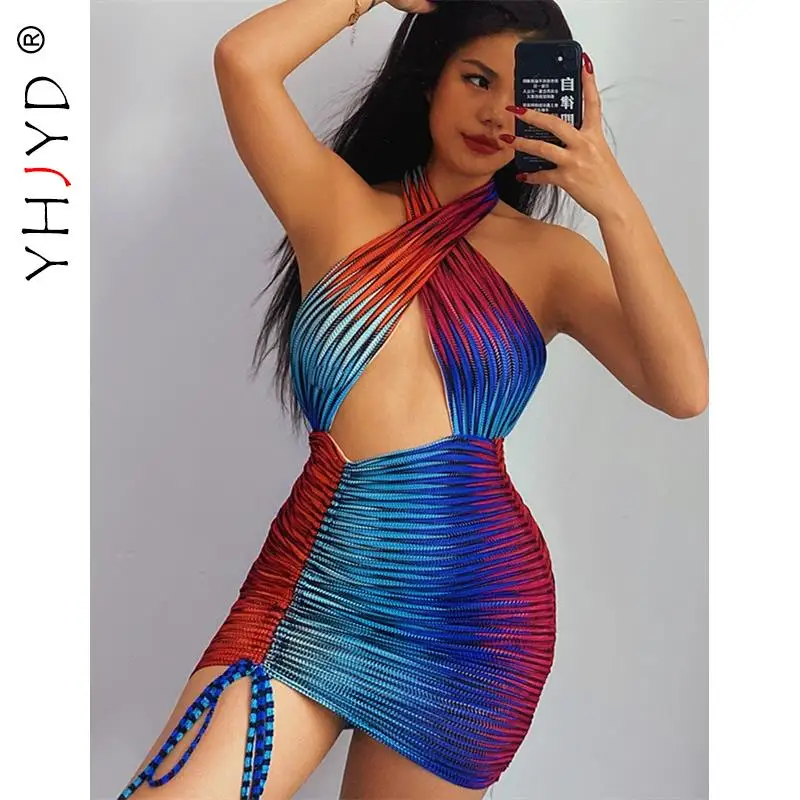 Пикантное облегающее платье YHJYD с открытой спиной и перекрестной лямкой на шее, летняя Клубная одежда, разноцветные вязаные мини-платья в по...