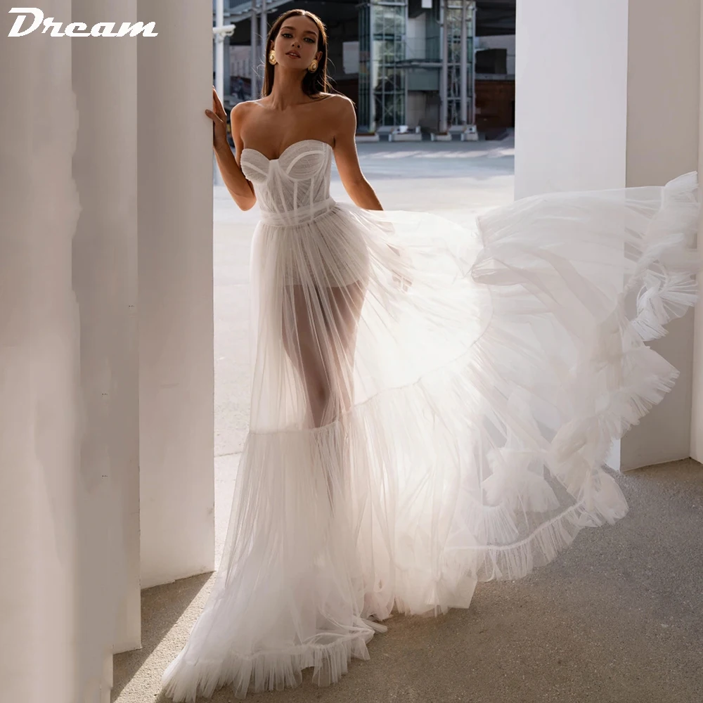 Пикантные Свадебные платья мечты без бретелек Плиссированные с оборками Многоярусное Тюлевое платье для невесты иллюзия с открытой спиной пляжное женское