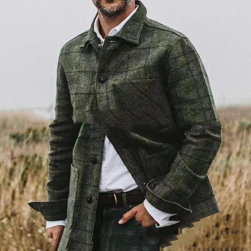 Men's Jackets Men Woolen Coat Plaid Long Sleeve Single Breasted Outerwear Autumn Windproof Cardigans Jacket For Daily Wear, Army green