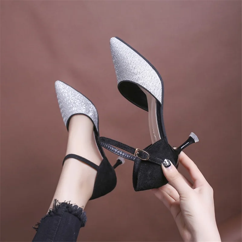 Новые женские туфли на высоком каблуке-шпильке женские босоножки все-матч с блестками, с заостренным носком и пряжкой модные тенденции 2021 В...